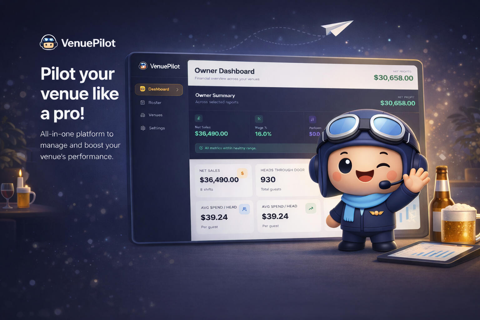 VenuePilot turns your daily sales and labour data into a simple end-of-day dashboard so you can see revenue, labour %, and estimated profit without exporting spreadsheets.